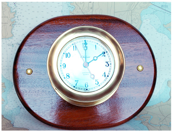 CHELSEA SHIP'S BELL QUARTZ CLOCKhis is a vintage, solid-brass Chelsea ship’s bell quartz clock. The clock keeps perfect time and rings the standard “ship’s bells” on the hour and half hour. When purchased it was quite tarnished therefore we feel it was used onboard. It was polished, buffed and sealed with a clear brass lacquer. Today, Chelsea sells these clocks new for $550.00 (with no mounting Board).