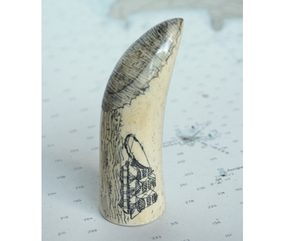 "THE WHALER" TOOTH SCRIMSHAWThis is a piece of bone (not sure what kind... maybe whale??) that has been carved to resemble a whale's tooth then handsomely scrimmed depicting a whaling ship and her dories on the hunt. If you look closely at the pointed end of the tooth you will note that another piece was cleverly laminated on to form the tooth design. The scrimshander "CP" signed and dated (1957) his work. This antique piece is very well done and exhibits extremely good detail.