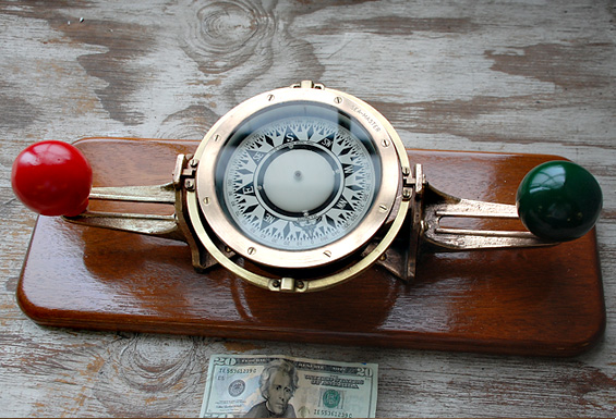 ANTIQUE "Seamaster" SHIP COMPASS ... Pre 1940This compass was used on an Alaskan crab fishing boat. It is solid brass and the "monkey balls" are steel (these are used compensate for internal magnetic forces onboard). The compass was in rough shape when we got it. We restored it to near new condition… compass base and balls were painted; the brass was polished, buffed and sealed with a clear brass lacquer; and a new mahogany mounting board was made.